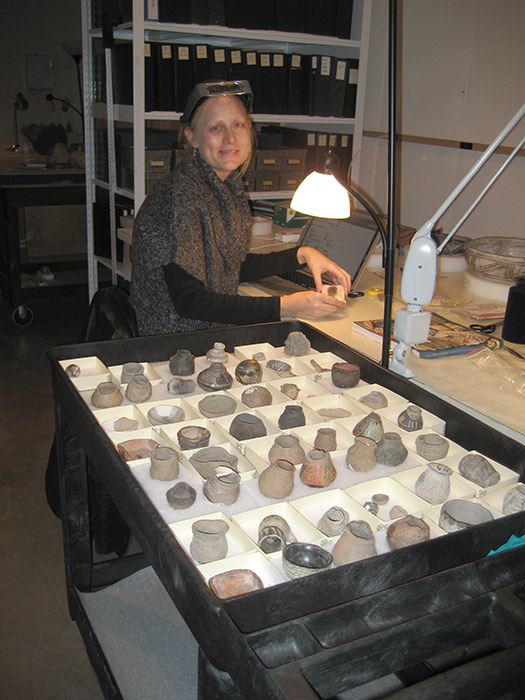 Conservation graduate student intern, Crista Pack, surveys minature pots.Conservators usually specialize within the following areas: 3-D objects, paintings, works of art on paper, textiles, photographs, or books and archives. Ethnographic/archaeological conservation is considered a special focus or sub-group of objects conservation. Professional conservators abide by the American Institute for Conservation Code of Ethics; this code has become part of the Museums of New Mexico Collections Policy which is a/the guiding document for Museum Resources Division Conservation Unit.