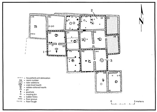 During archaeological salvage operations at the Ormand Village site in 1965, two of the areas excavated were referred to as the North and East Roomblocks. They dated to the last occupation which was during the Salado period, AD 1300-1450. The East Roomblock included 14 rooms with walls of adobe poured or beaten into layers on top of cobblestone foundations. Large beams ran across the rooms supporting the roof, which was made of layers of smaller sticks laid in a perpendicular fashion across these beams, then sealed with a final layer of adobe. The wall foundations and a little adobe is all that survived for archaeologists to excavate. These ruins were sketched to show each room and what was found in them.